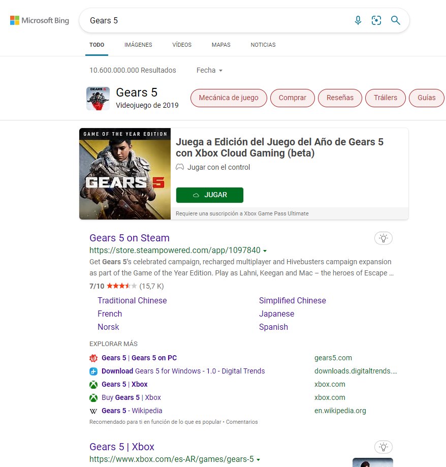 Al buscar un juego compatible con Xbox Cloud Gaming en Bing, el primer resultado que aparece incluye un botón para Jugar, le avisará que requiere usar un joystick y también le dirá si es compatible con la función táctil. Al presionar en Jugar y si tiene una membresía de Xbox Game Pass Ultimate, podrá iniciar el juego en su navegador Microsoft Edge, Google Chrome o Safari.