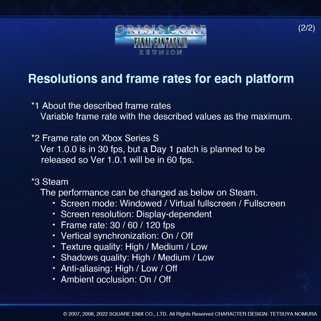 El productor ejecutivo Yoshinori Kitase dice: “Esto es más que una remasterización, un juego que cruza generaciones y plataformas. Estamos muy orgullosos de todas las increíbles mejoras que el equipo de desarrollo ha podido incluir en CRISIS CORE –FINAL FANTASY VII– REUNION”. Se puede encontrar más información sobre todas las mejoras técnicas en un nuevo documento de preguntas frecuentes creado por los desarrolladores del juego.