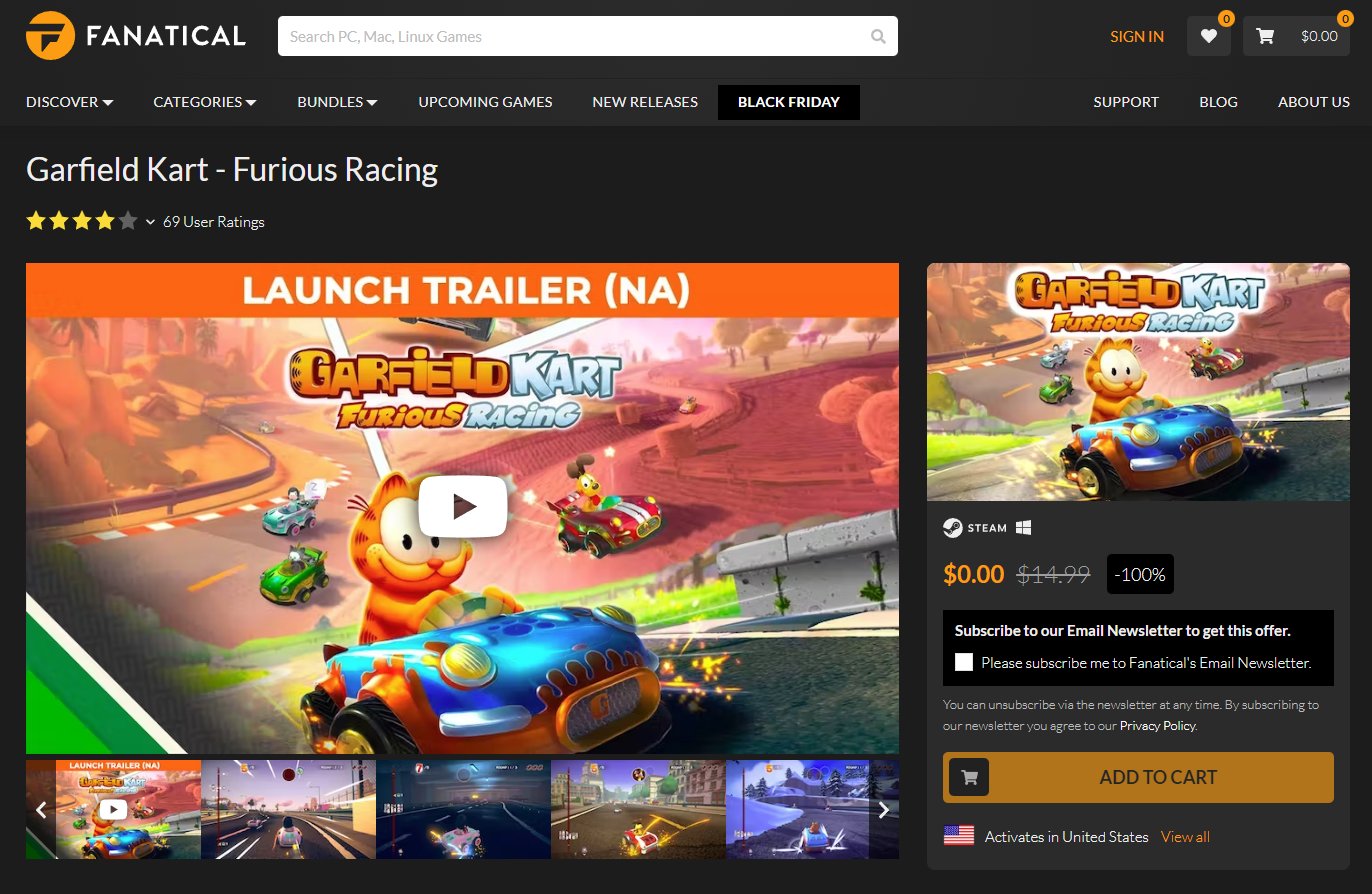 Tutorial para conseguir GRATIS en Fanatical el juego Garfield Kart – Furious Racing para Steam.