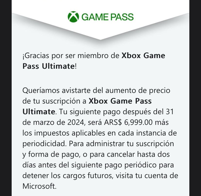 Durante 2023, los precios de las suscripciones Xbox Game Pass aumentaron 3 veces para los usuarios de Argentina, y algunos seguían pagando los precios anteriores a los aumentos, pero Microsoft ya les notifico que ese beneficio dejara de estar disponible.